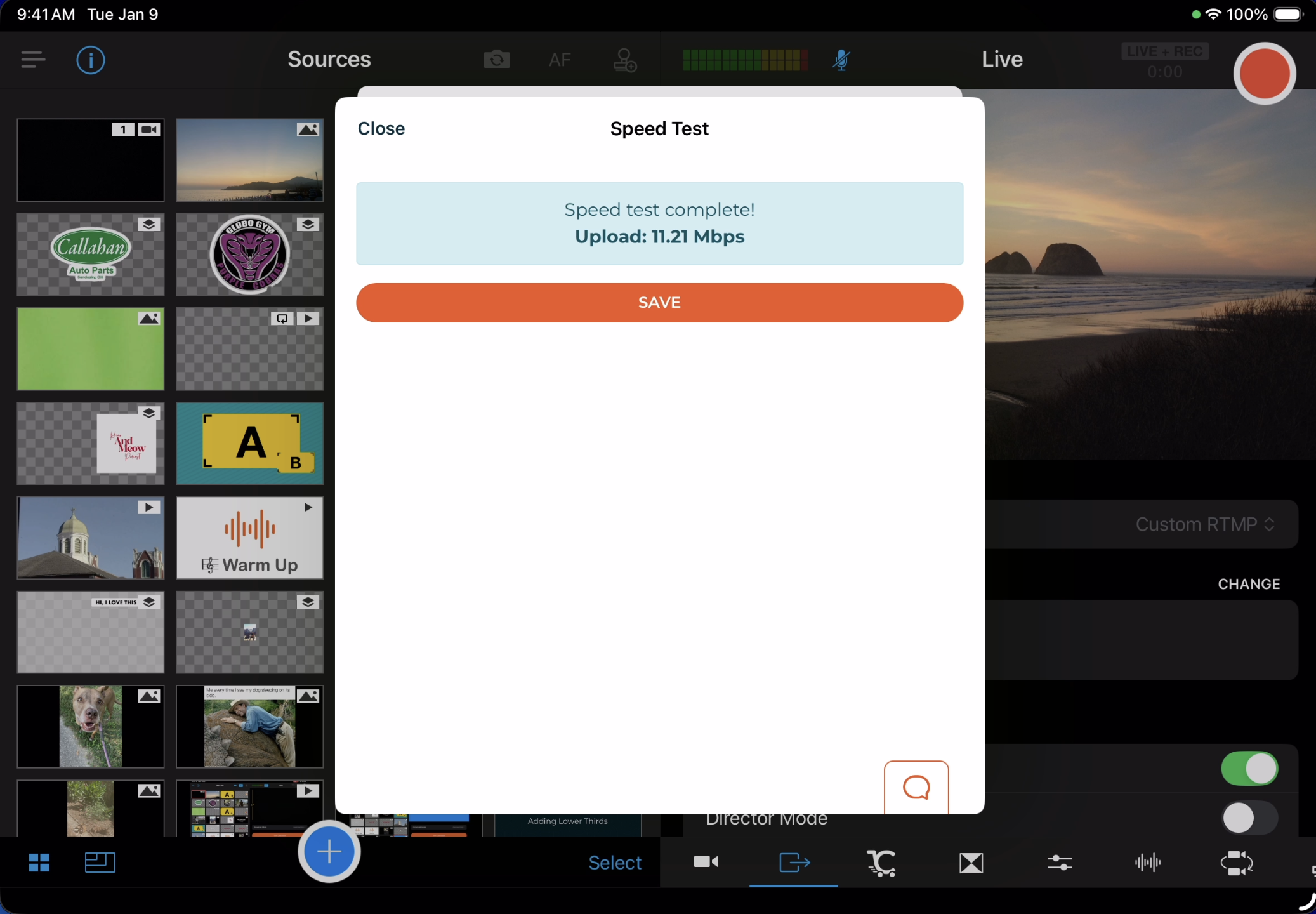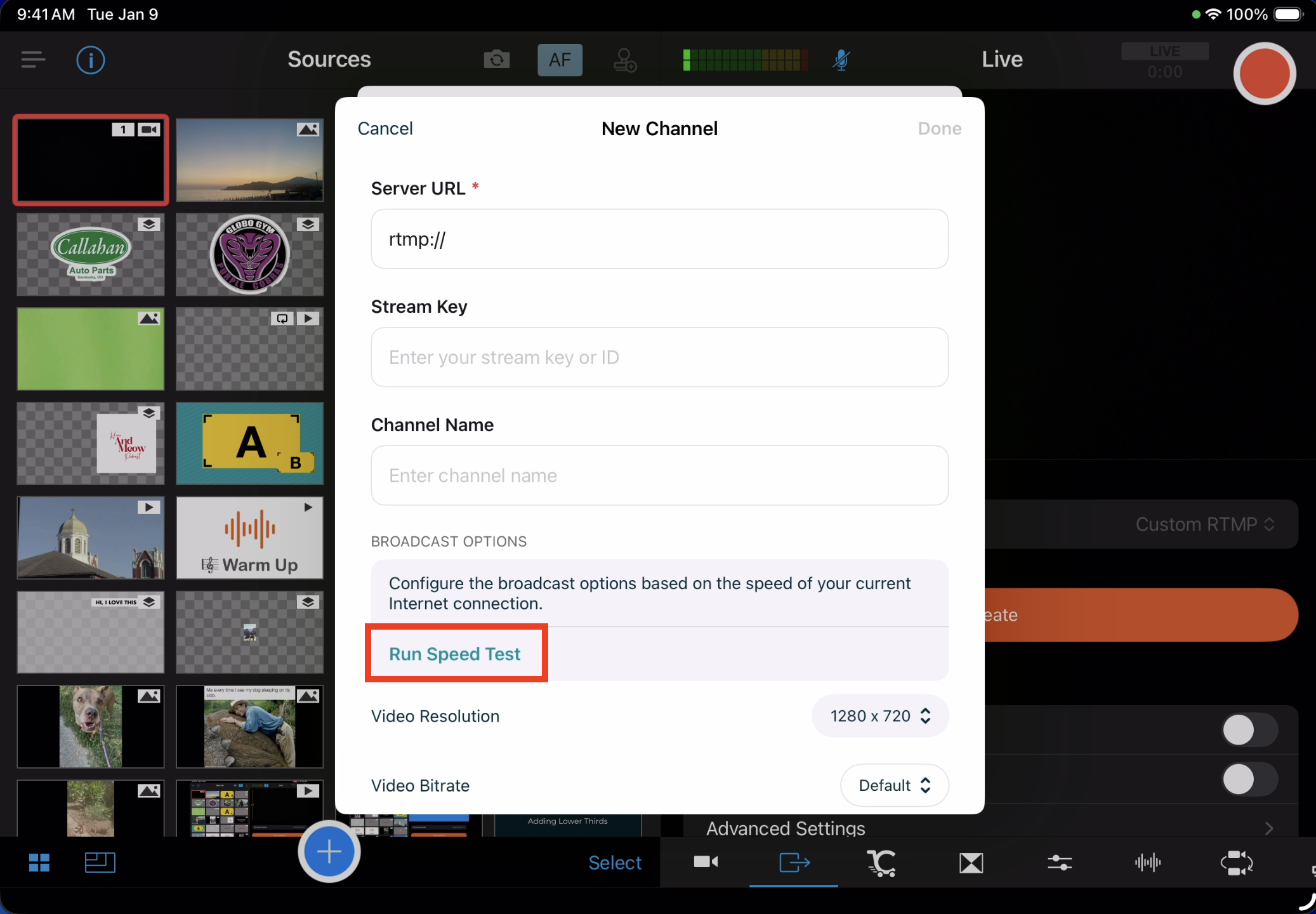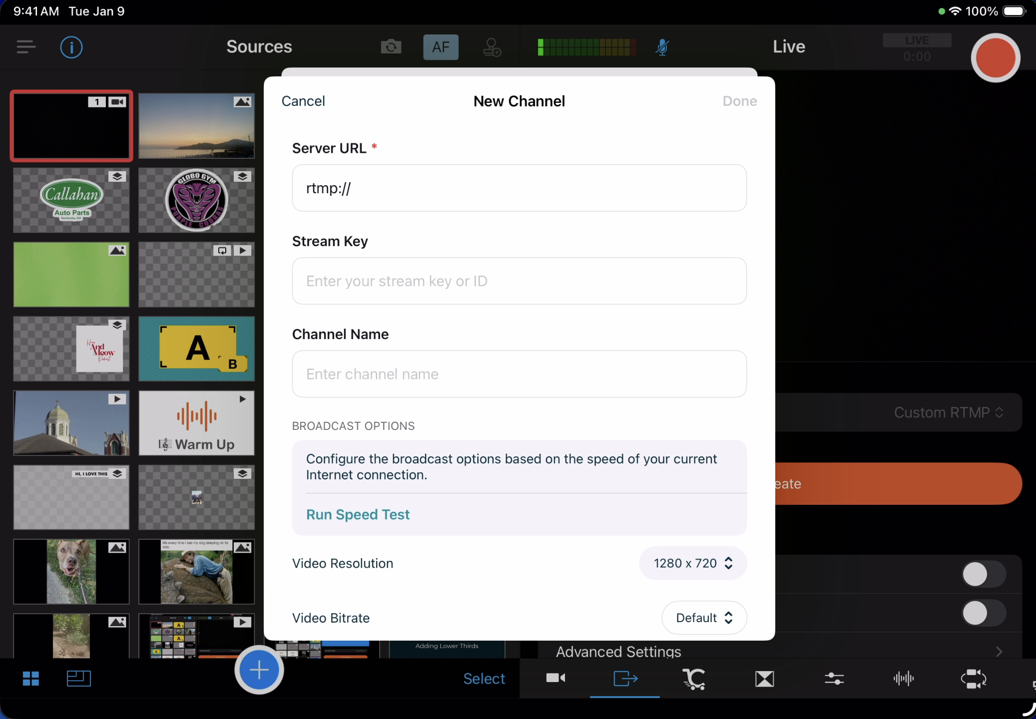 When creating a Custom RTMP channel in the app, Switcher will automatically adjust your quality settings based on a speed test. You can stream immediately after creating a channel, or you can save the channel to use later.