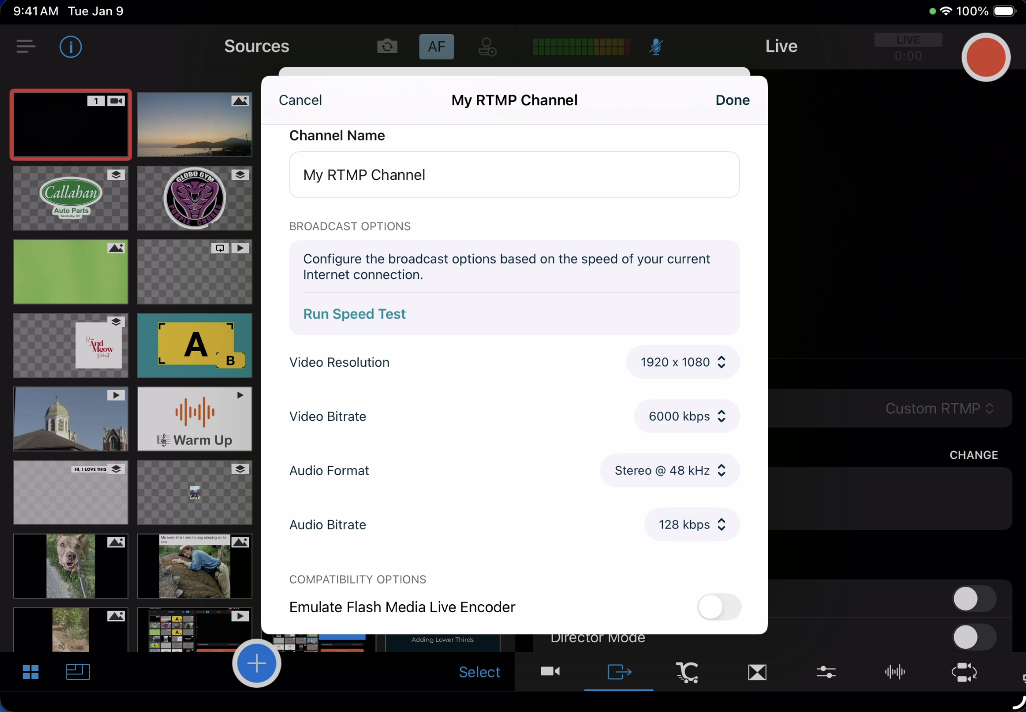 You'll see that Switcher has updated your Broadcast Options based on the speed test results. Making any other necessary adjustments and tap Done in the top-right corner to save your newly created Custom RTMP channel.