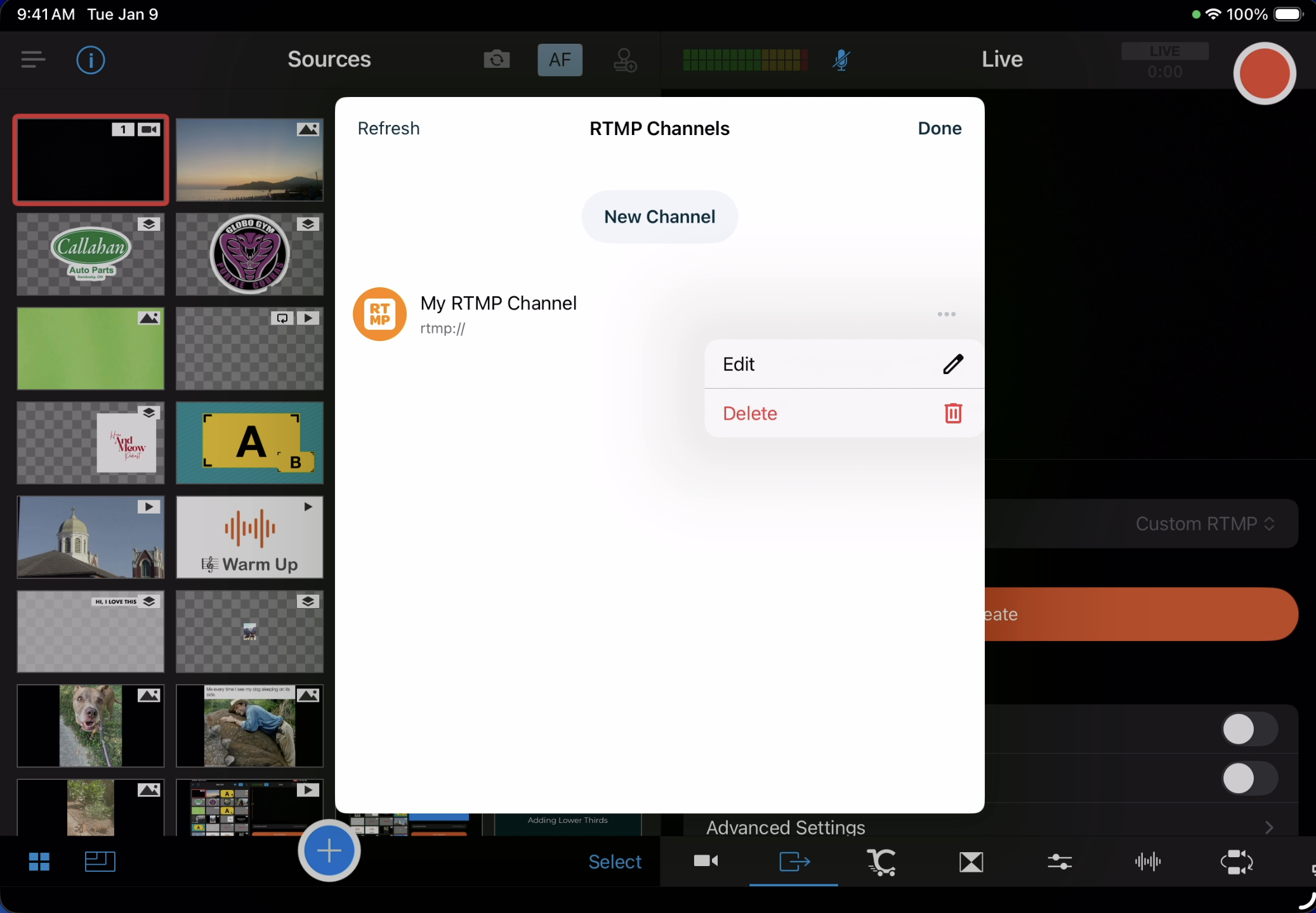- To edit an existing RTMP Channel, Tap the ellipsis (...) to the right of the channel and then Edit. You can also delete a channel in this location.