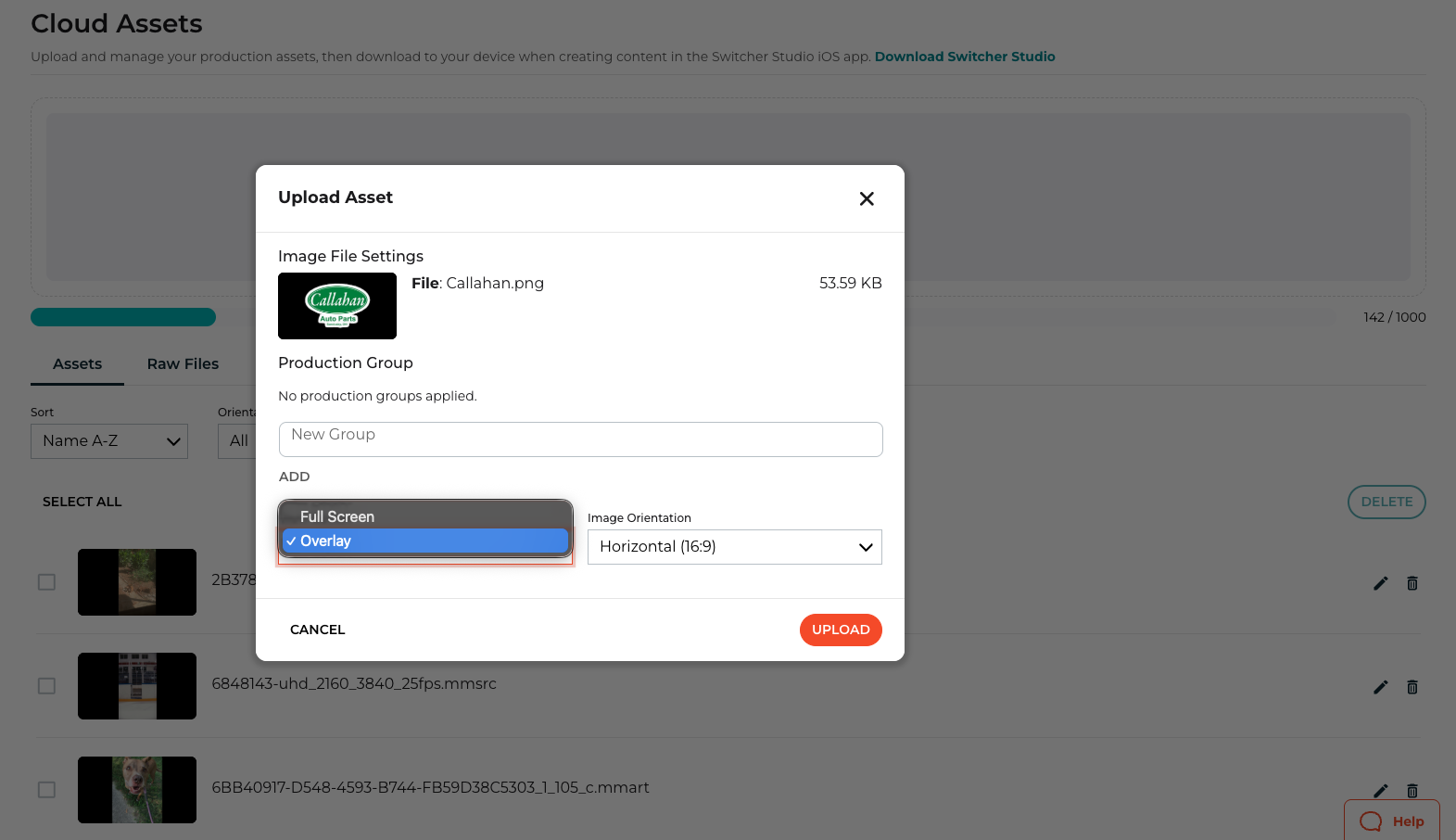 When you upload an asset to Switcher Cloud using the Switcher Studio Dashboard, you have the option to upload the file as Full Screen or Overlay. If you select Full Screen, your file will be uploaded as a full screen asset with no transparency. If you select Overlay and your original file has a transparent background, the asset in Switcher Studio will maintain the transparency.