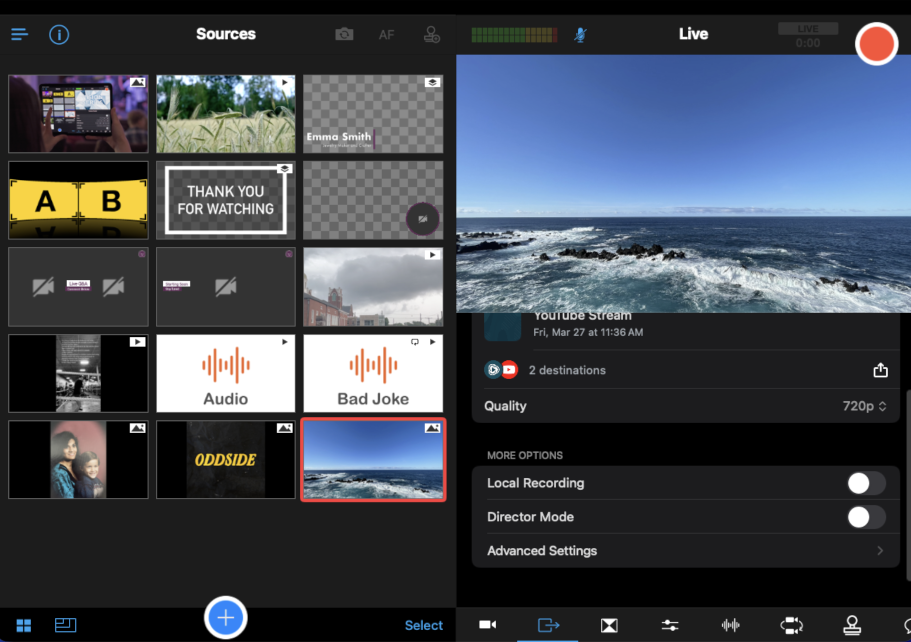 Now, when you tap the record button, you will go live ONLY. Notice that in the top-right of the screen, the greyed out box now says Live, rather than the original Live+Rec as shown in the images below.