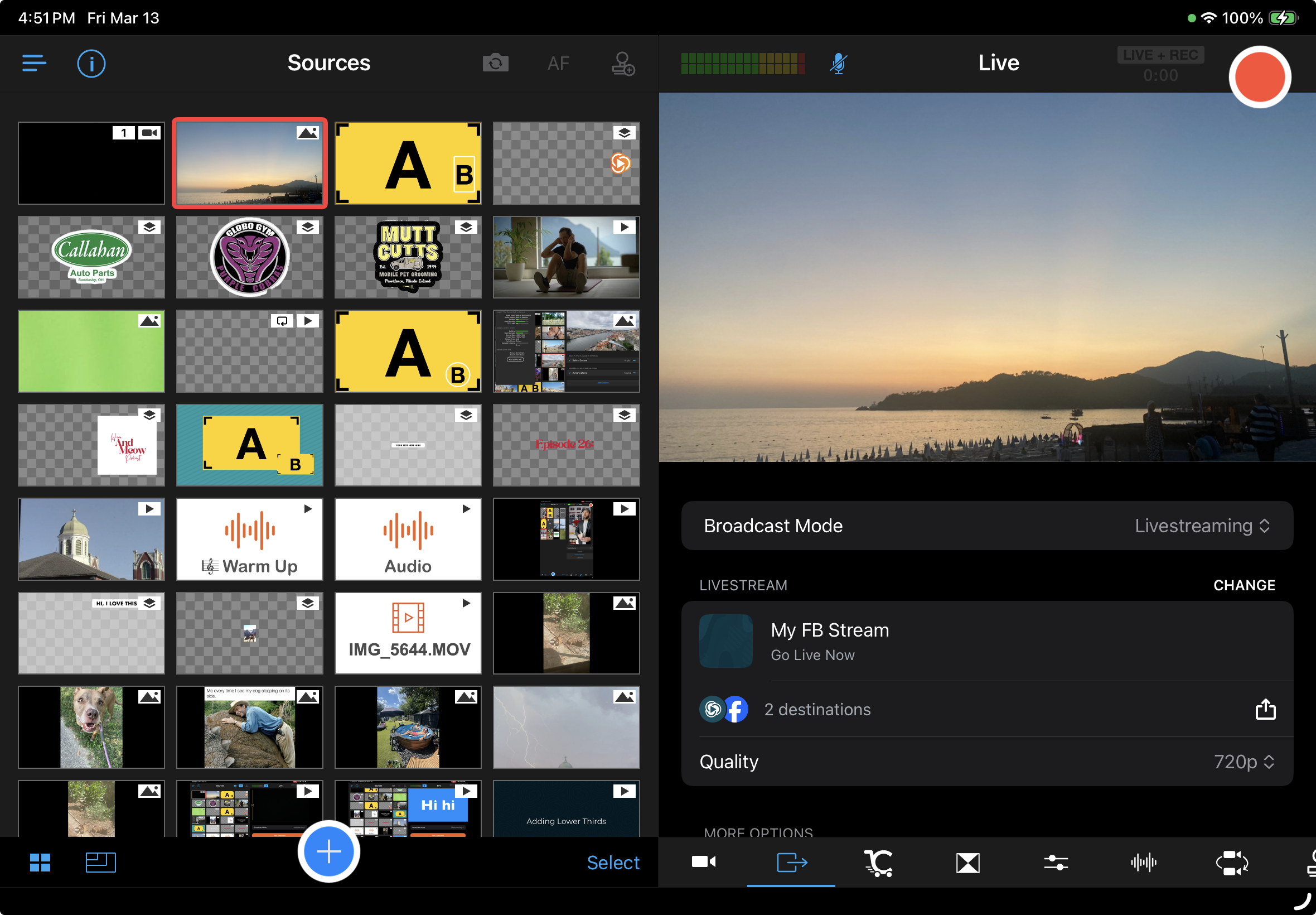 Once you see the blue checkmark next to Facebook, you can tap the record button in the top right corner to begin streaming.