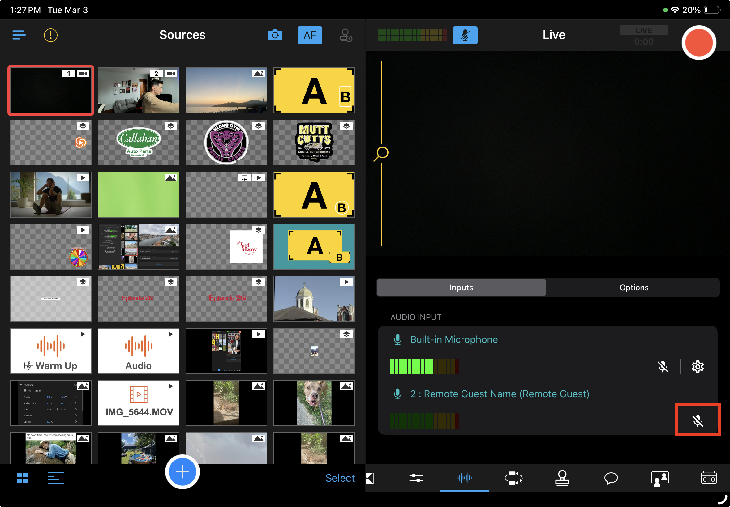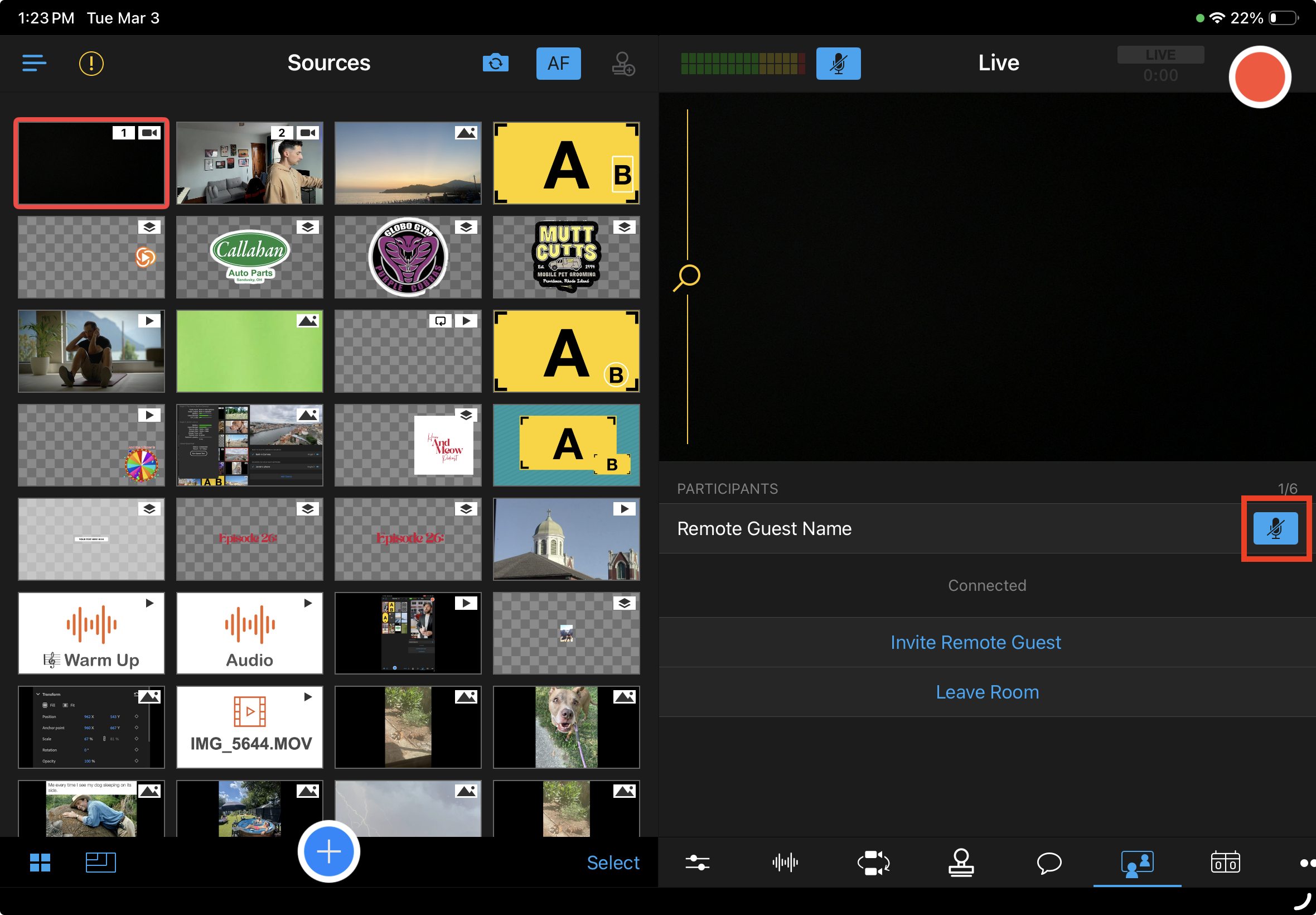 You have the option to mute guests by default when they join the chat room. Simply toggle the Mute Guests' Audio by Default option to On when you're on the Remote Guest tab. You can also mute individual guests at any time during the production. Simply go to the Audio tab (sound wave icon) and tap the microphone icon next to their name. When the icon is highlighted blue, your guest is muted.