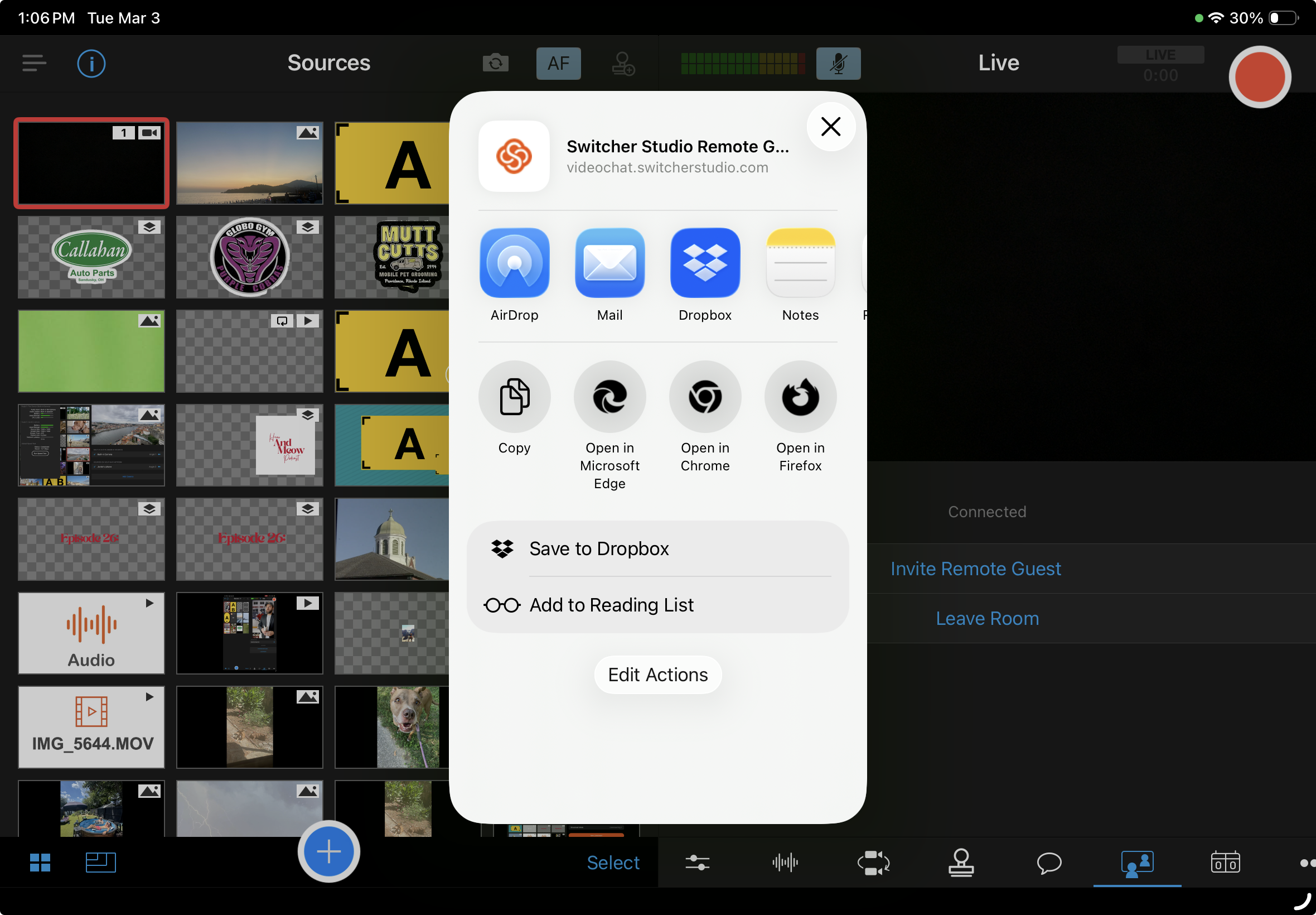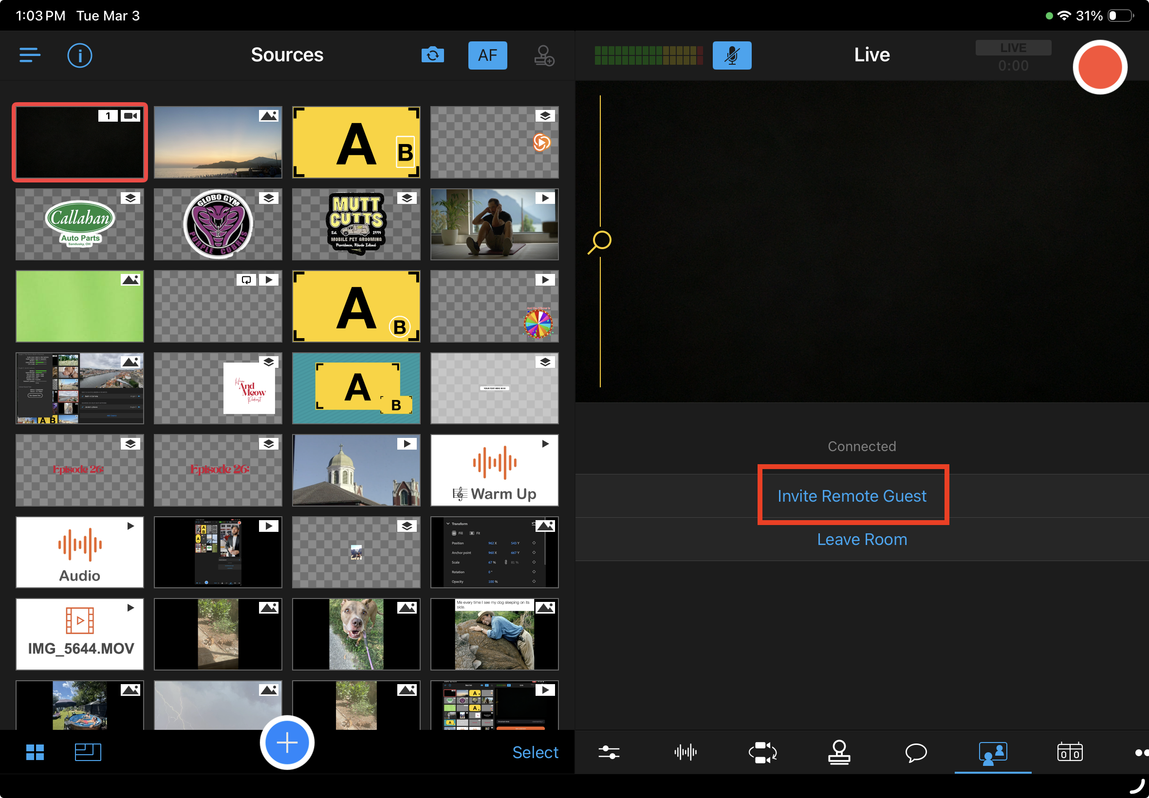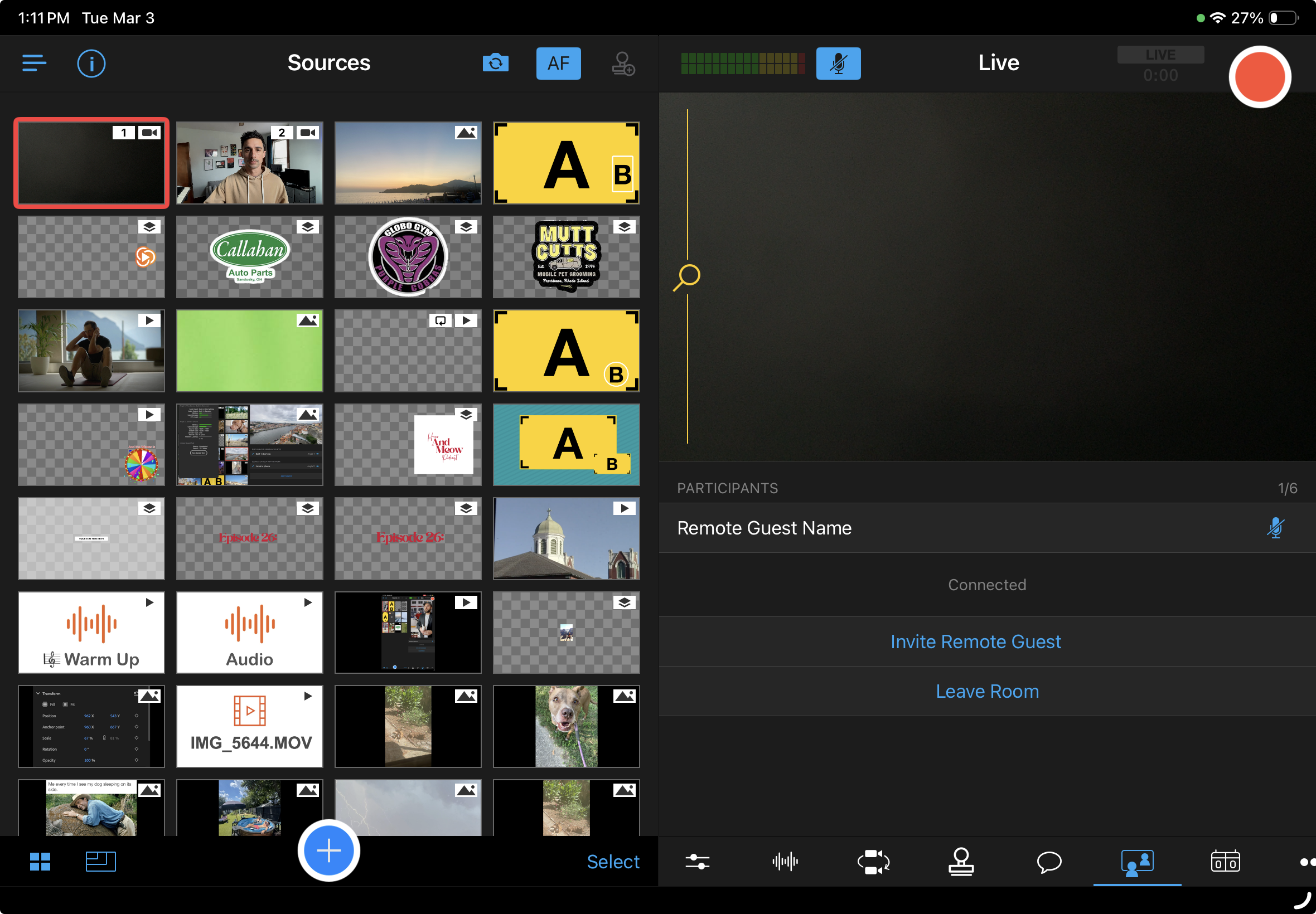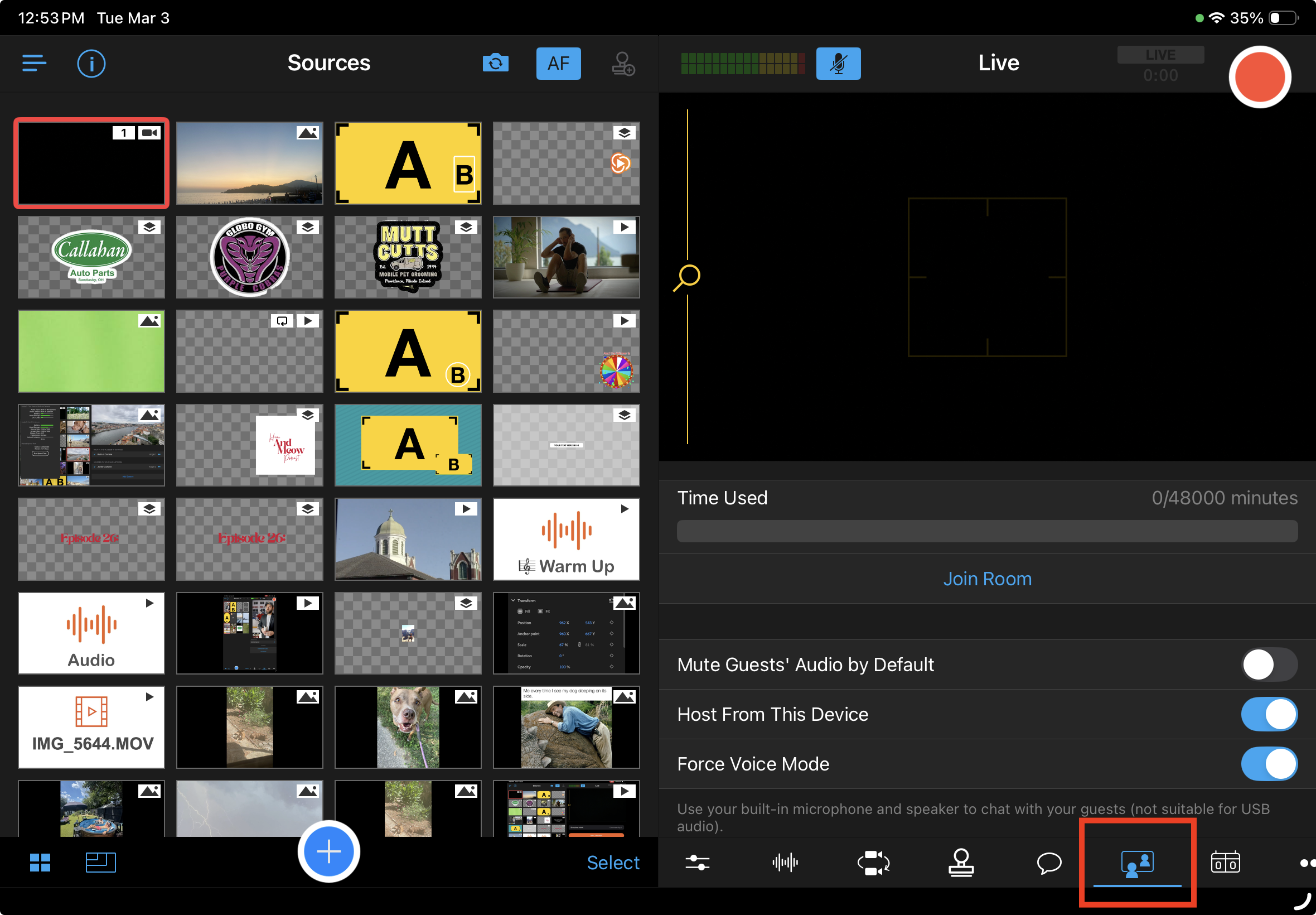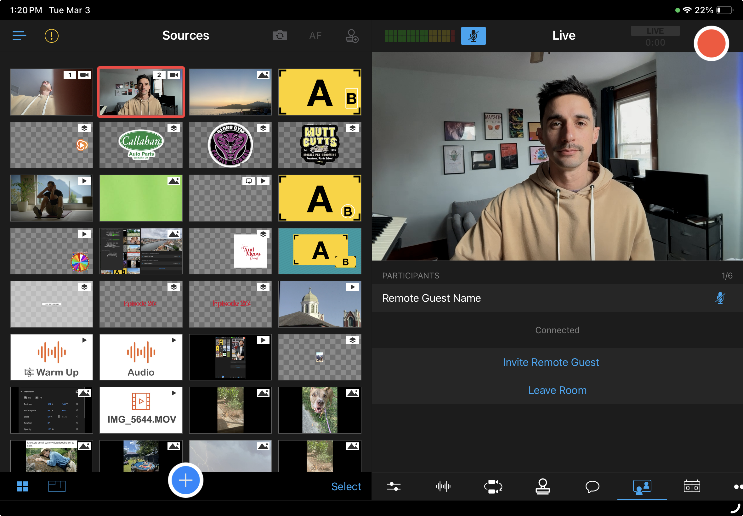 - Once your guests have joined the room, they will show up in the Sources panel. Tap their camera feed in the Sources panel to add it to the live feed.