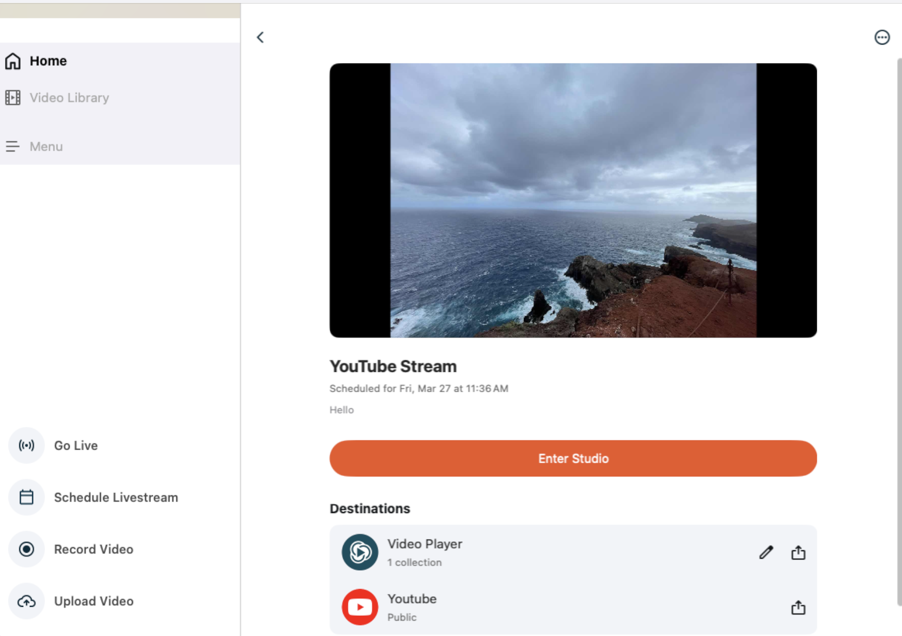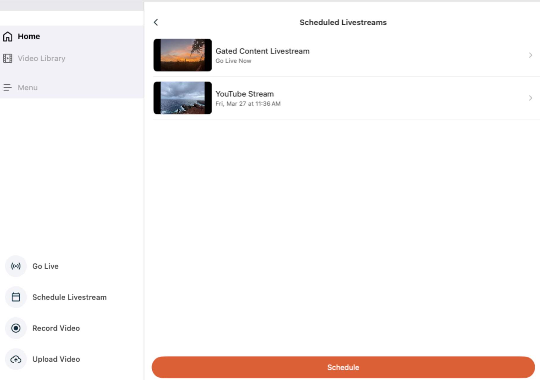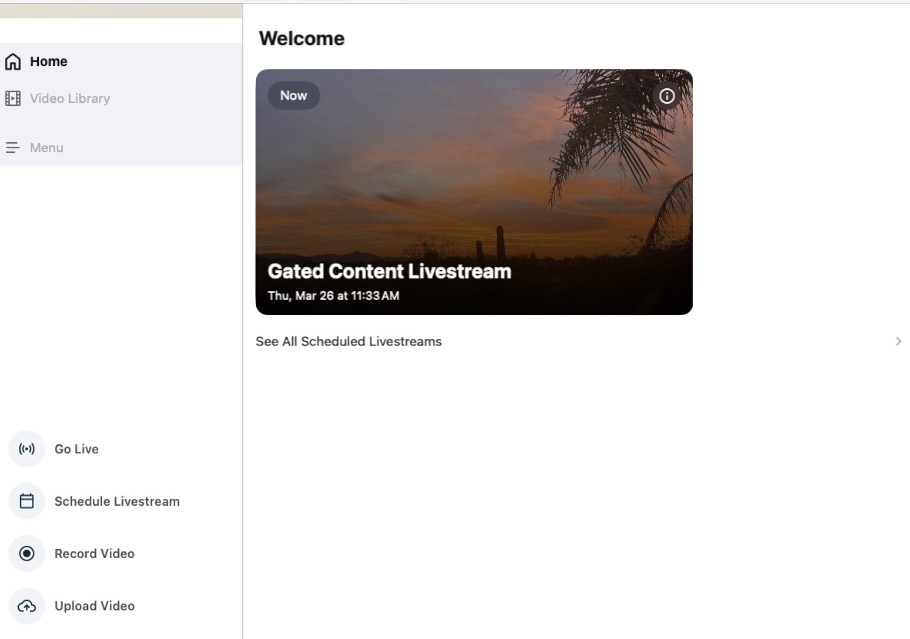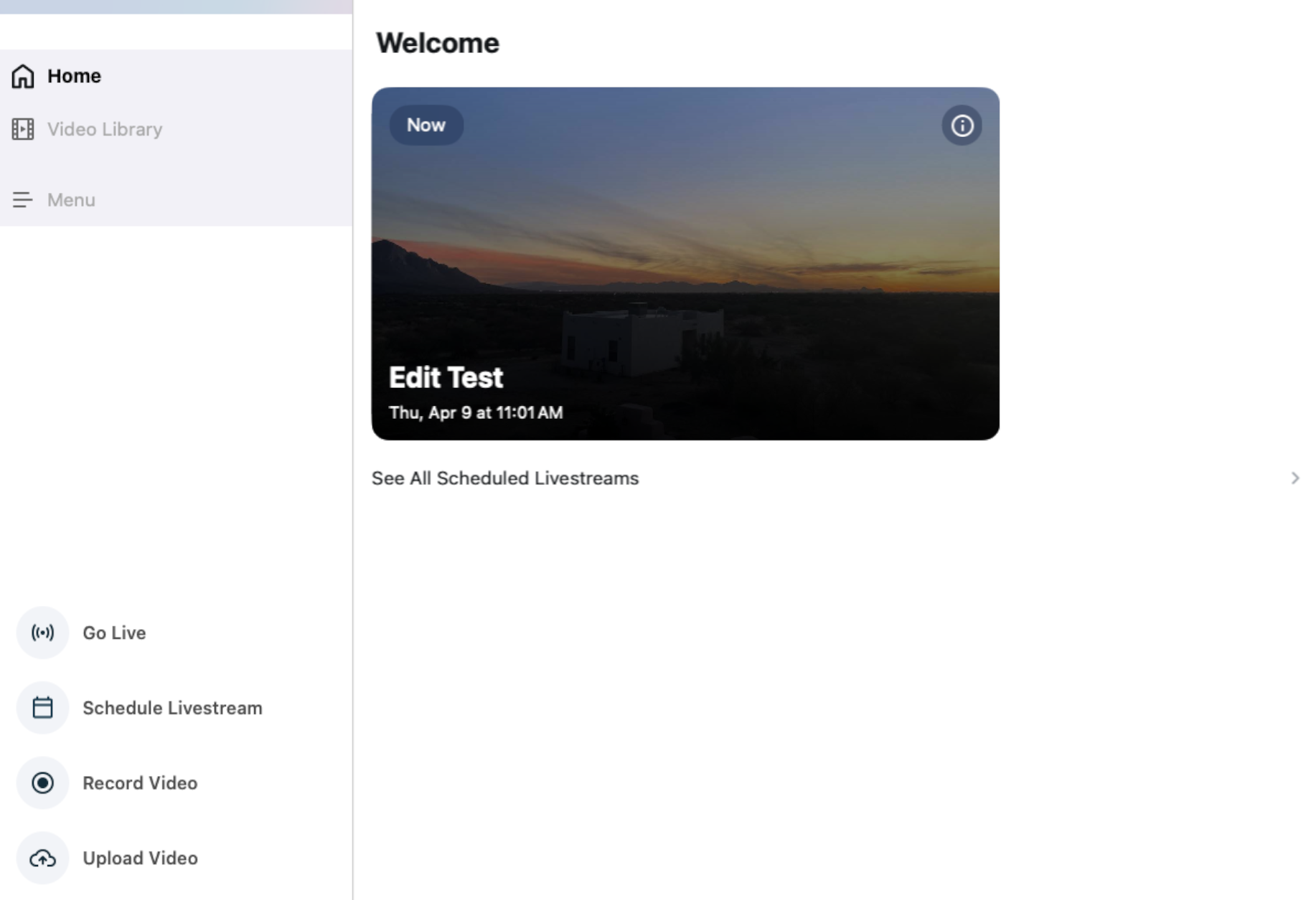 - Your most recent Scheduled Livestream will show in the Home Screen