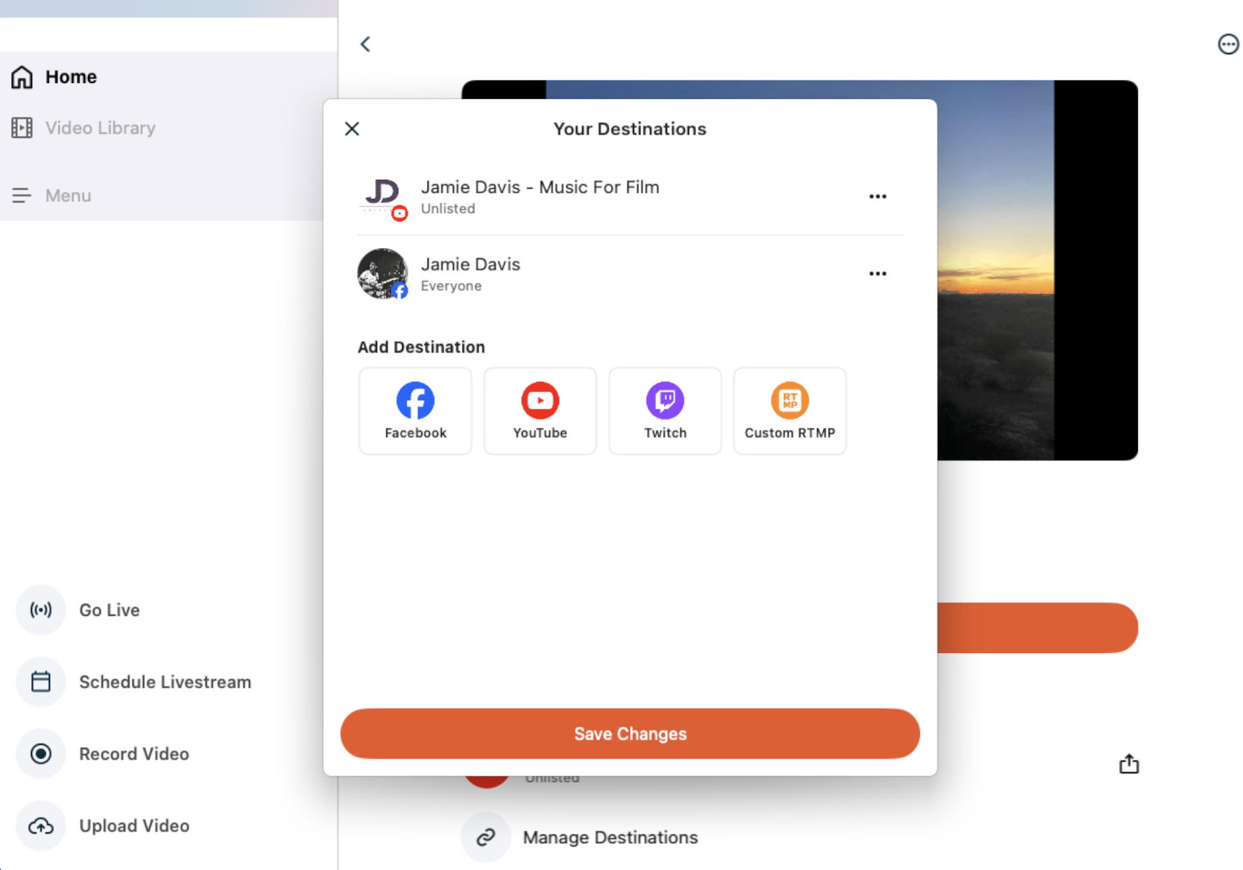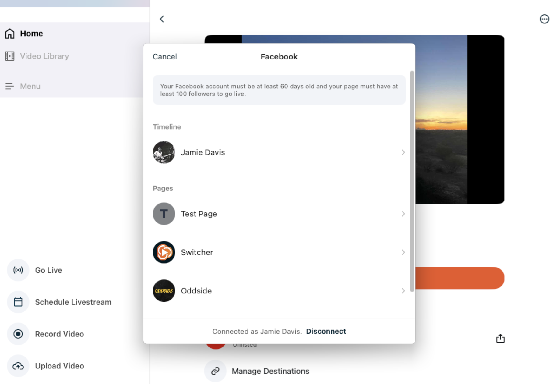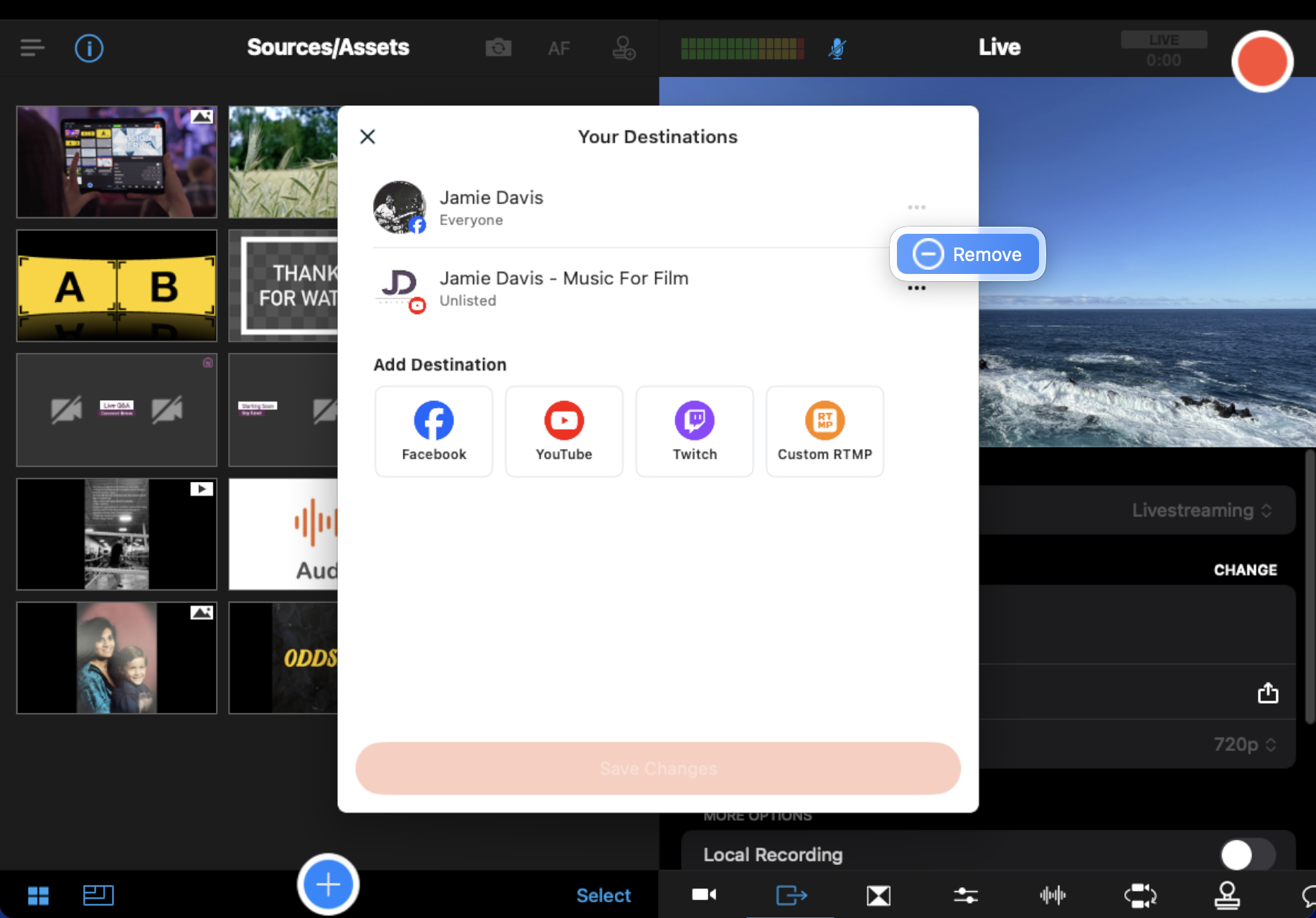 - To add a destination, tap the platform icon (e.g. Facebook) and complete the selection process for that specific destination.
