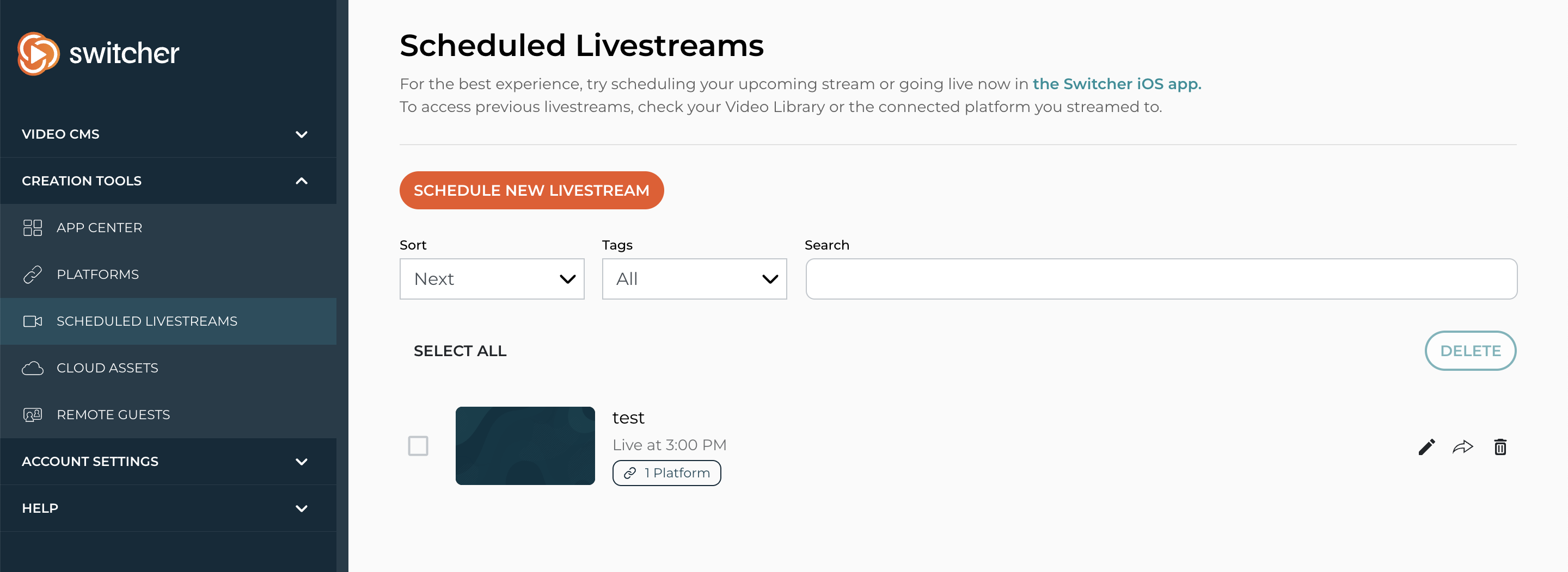 - Go to the Scheduled Livestreams page in the Switcher Studio Dashboard