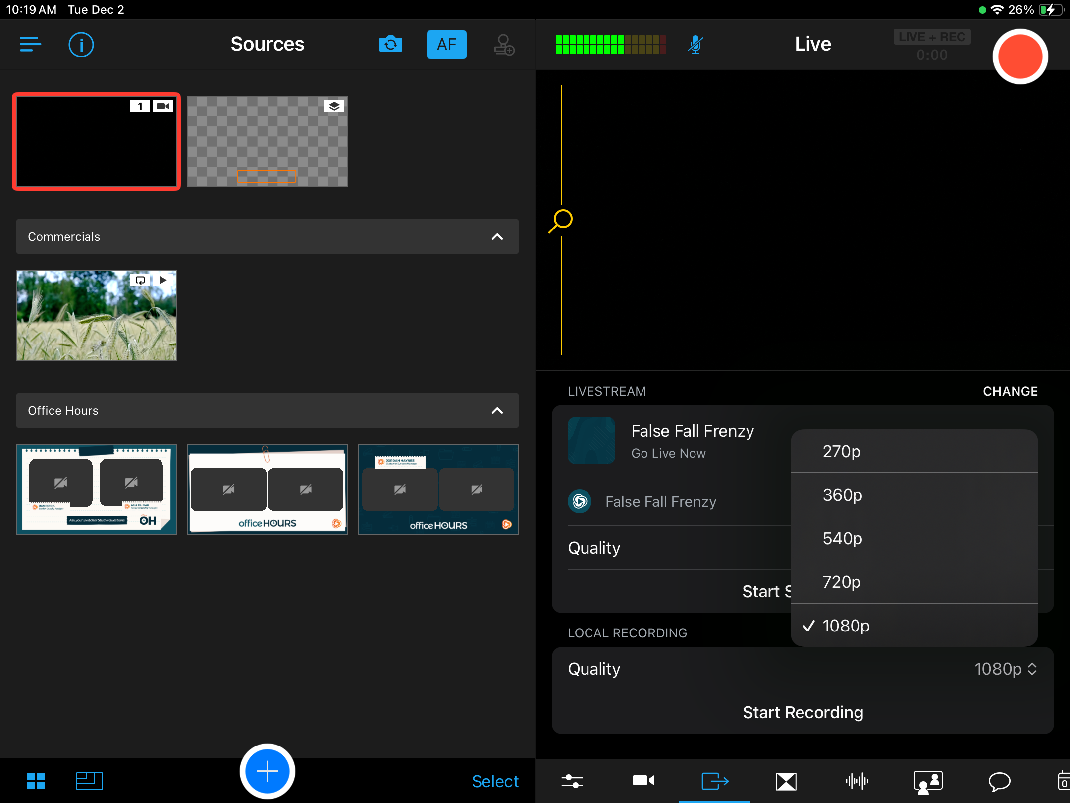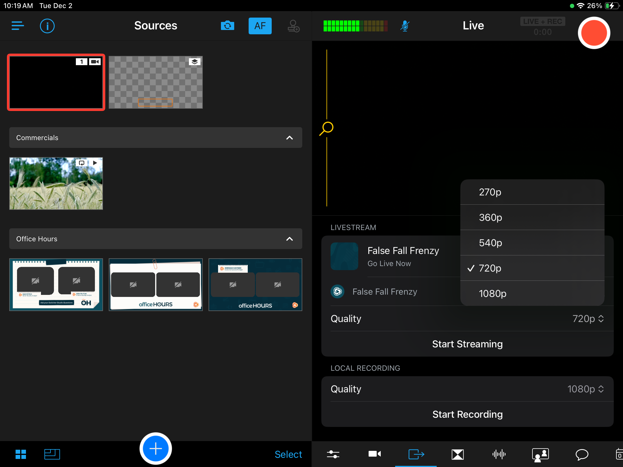 Choose your destination(s), and then enter your Livestream Details. The Quality is set to 720p by default. Tap on the 720p button.