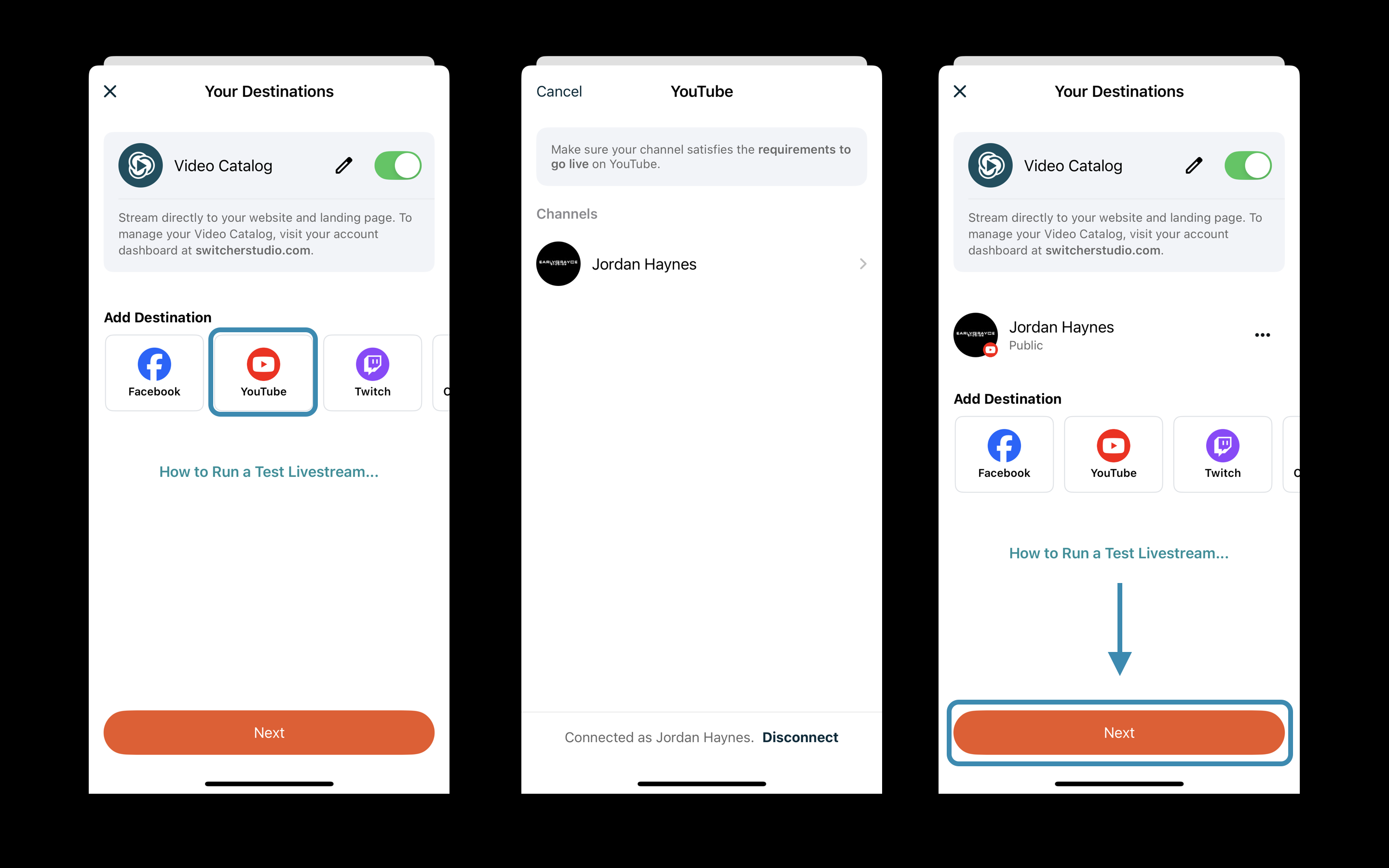 To link your YouTube channel using the Switcher Studio app: