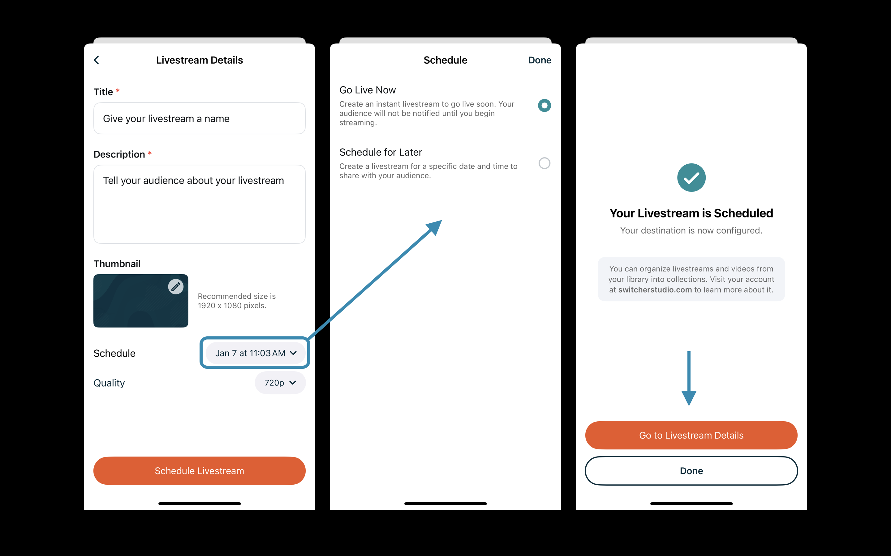 After selecting a stream Quality, tap Schedule Livestream