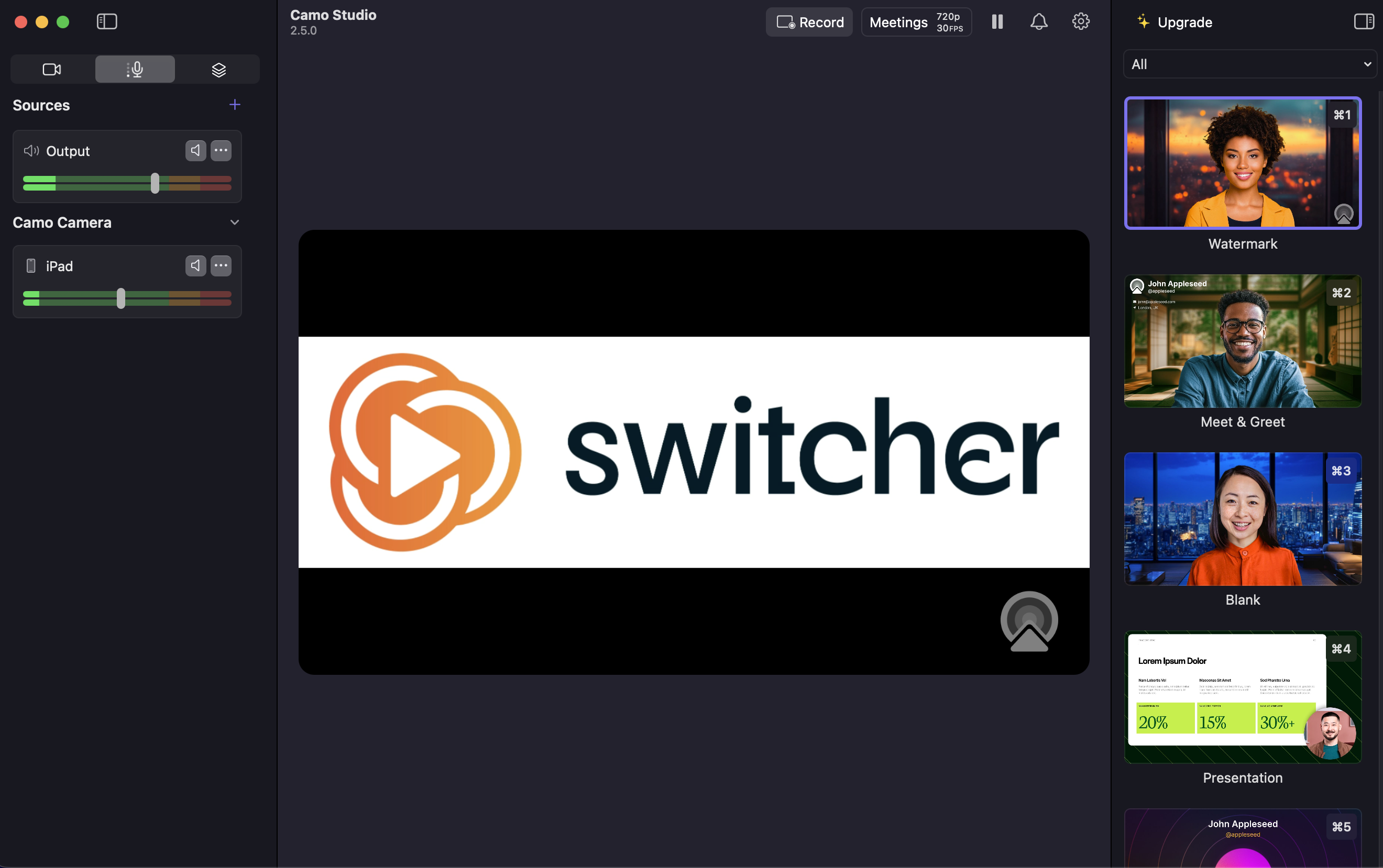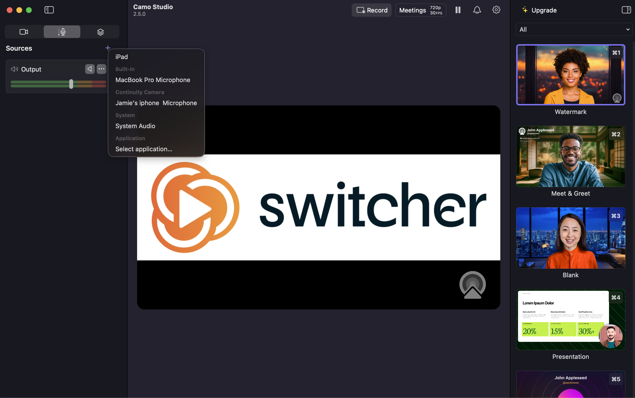 Switcher as a Webcam is a feature that is powered by an integration with Camo, which makes it easy to push the Switcher Studio live view into third-party video conferencing tools like Zoom, Google Meet, Microsoft Teams, WebEx, and more.