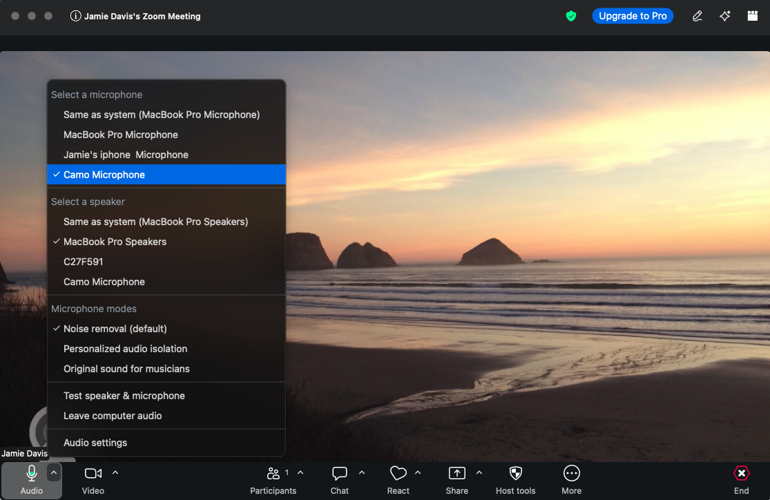 • Then, in the video conferencing tool (Zoom, Meet, etc), select Camo as the audio source. This will allow Camo to sync the audio source with the camera feed coming from Switcher to avoid any latency issues when being sent to the video conferencing tool.