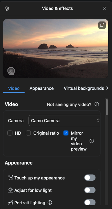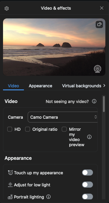 To use Switcher as a Webcam with a video conferencing app, you'll simply connect Switcher to Camo, open a third-party program that uses a webcam, such as Zoom, Google Meet, Microsoft Teams, WebEx, etc. From there, the exact steps will vary by program, but the overall process is the same: